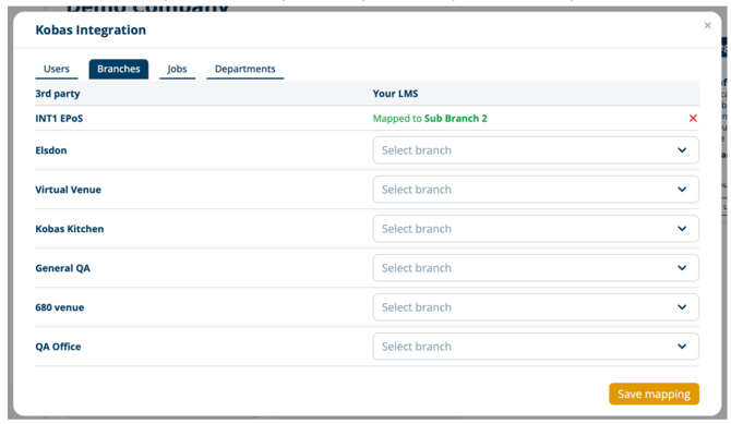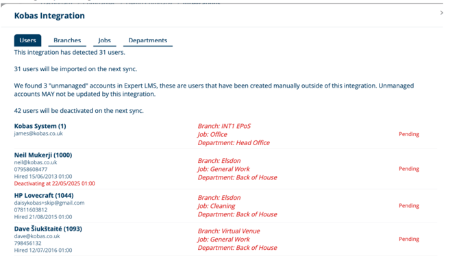 Expert LMS will try to automatically match branches, jobs, and departments from Kobas.