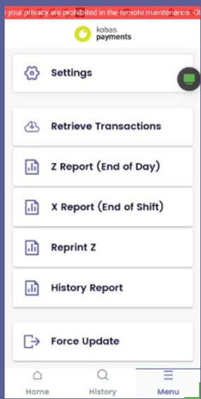 Once the terminal is on Wifi, you should press the menu as above and press "Exit". This will take you to the standalone app. Here you will need to log in (usually user ID and password is 1234). If you scroll down, you will see "Force Update" - press that and wait for the device to reboot.