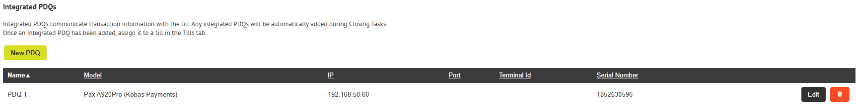 When you have done that, you will need to go the Tills tab and edit each till to link one or more PDQ to them.